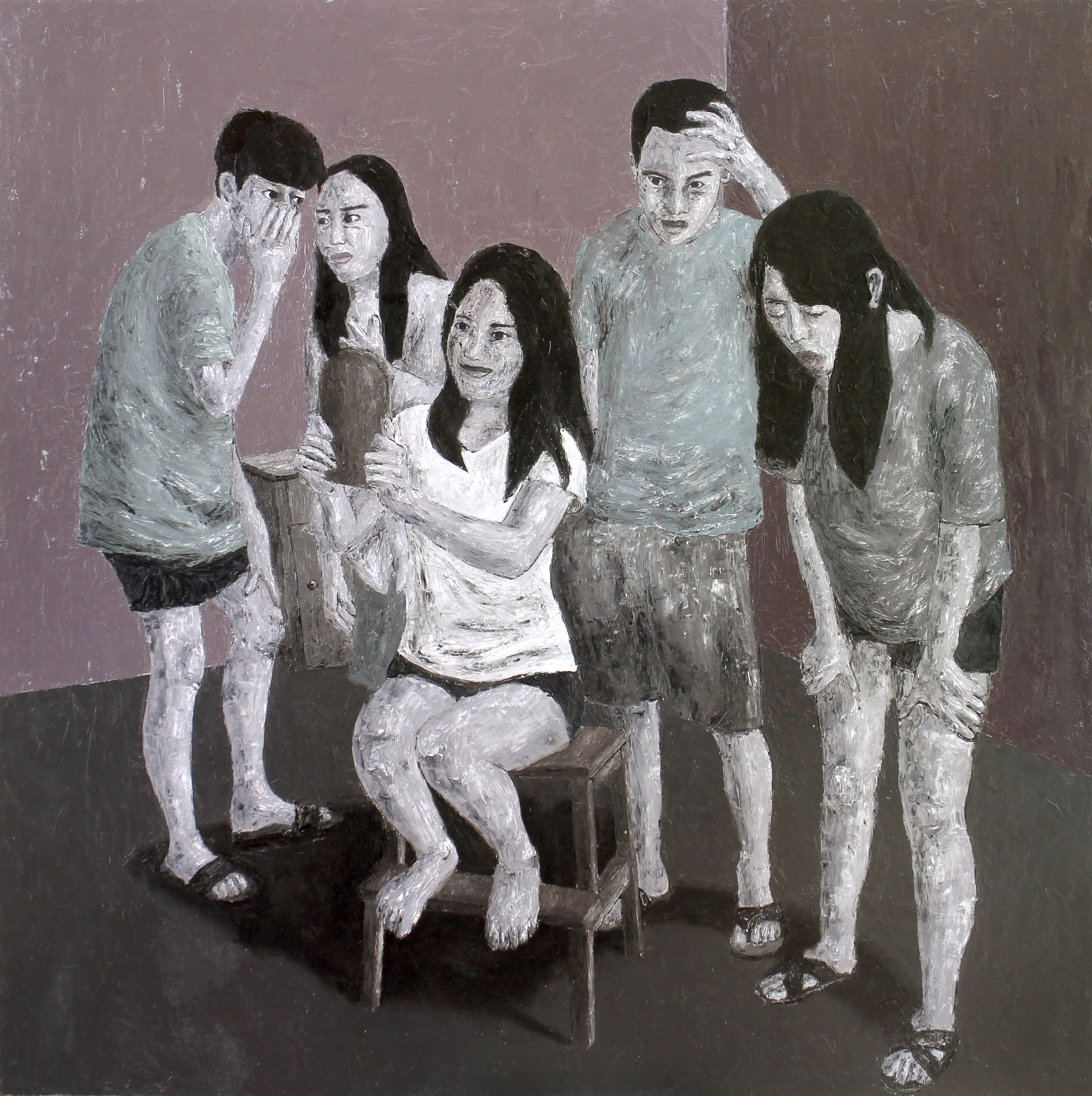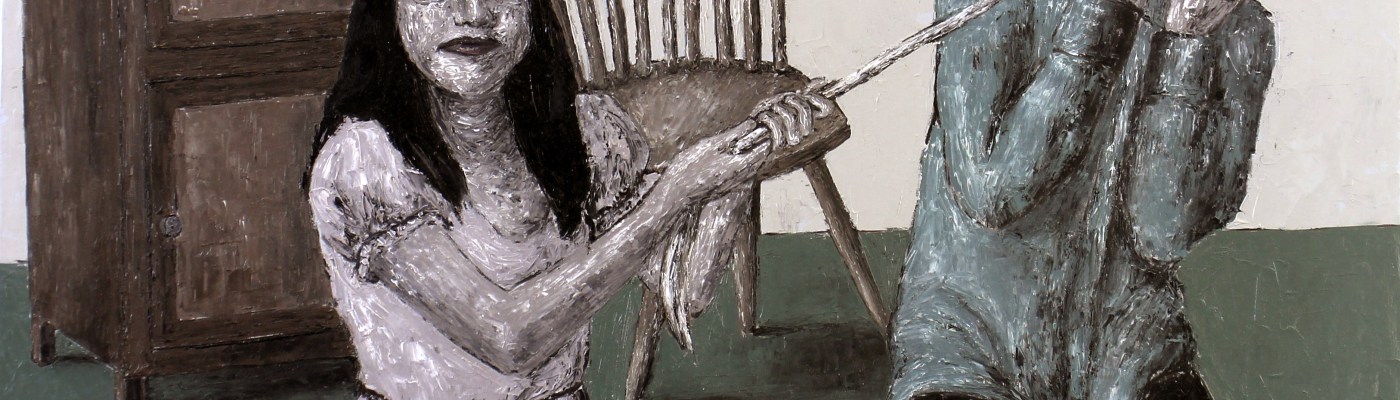 In this exhibition of new works, Johanna Helmuth paints scenes in which the self, social life, and relationships are disfigured and marred by factors that taint their ideal functioning or in some instances, cause them to be dysfunctional. As an artist, Helmuth’s subjects often explore the darker side of human tendencies and behavior, confronting our deep-set fears and anxieties. The works in this series speak of common human experiences, experiences that resonate with our own, and troubling social realities that are often relegated to the realm of the norm and simply dismissed with an attitude of nonchalance. In both symbolic and literal fashion, we see the individual succumbing to depression, helplessness, and the pressures of living up to social standards. We are presented with haunting figures of dominance and subordination, apathy, contempt and distrust. We see the weakening of the family and other social bonds, camaraderie, and values by ill intent and the seemingly harmless practice of talking behind one’s back and spreading rumors. All these images of decay and decadence prompt us to reflect on the toll our own actions collectively take on the social fabric. They raise important questions about human nature and expose its cracks and fissures.