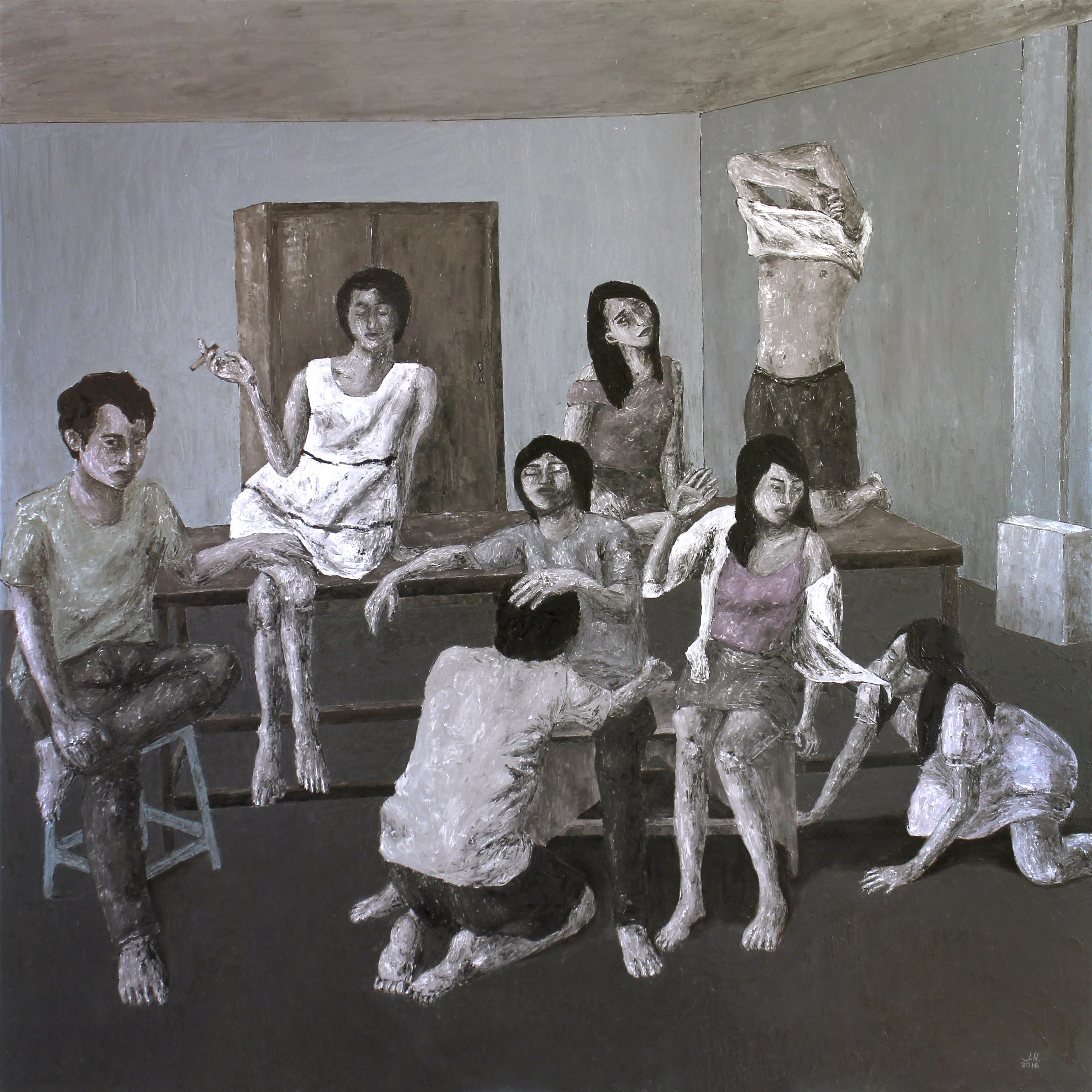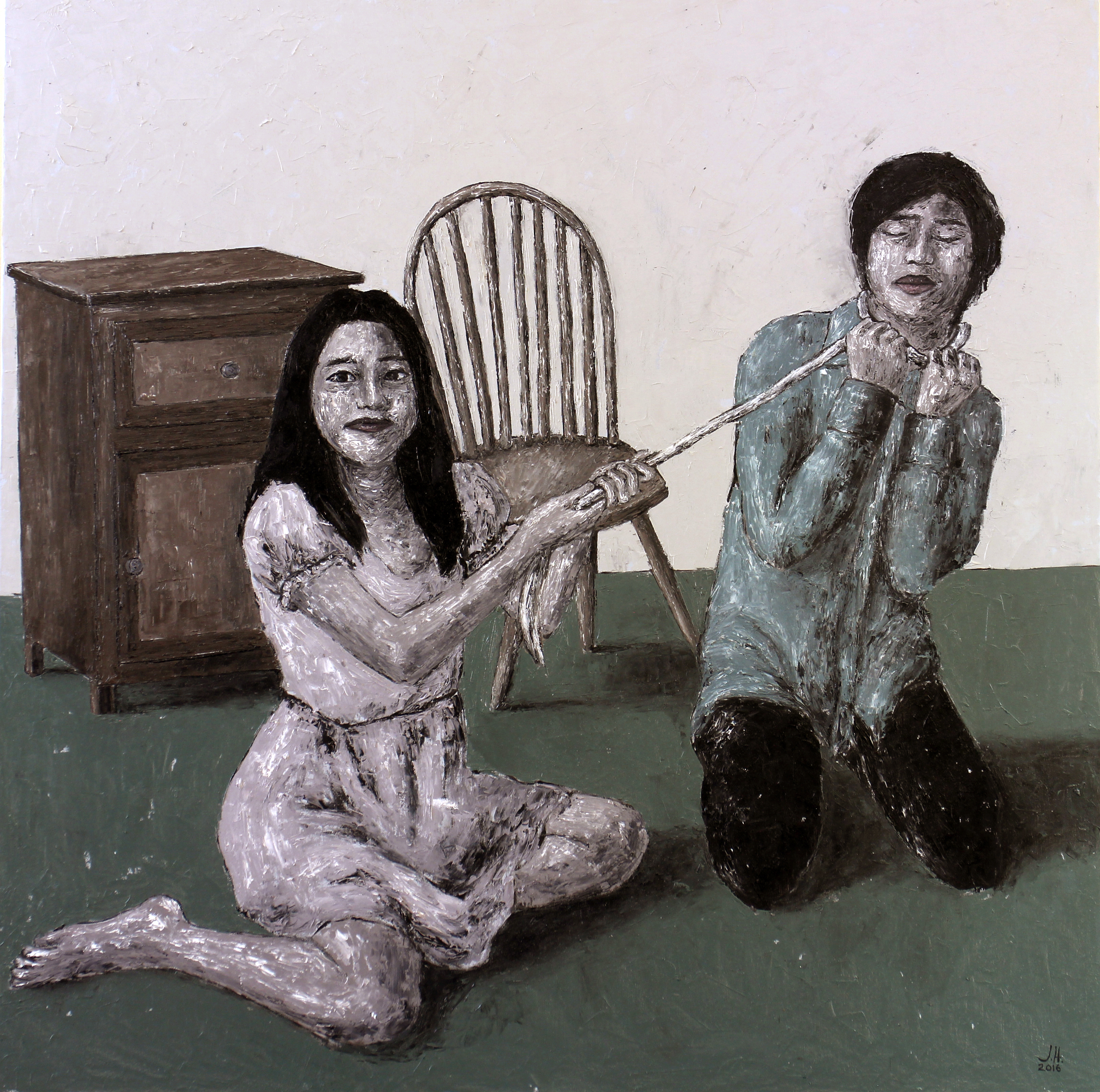The compositions bear her characteristic muted colors of mostly earth tones, effectively evoking a gloomy and desolate mood. Each picture tells a story, as in her past series, like snippets forming a larger narrative. Among the works are Dinning Hall, a clever metaphor for sexual appetite and uncontrolled urges; A Mother’s Cry, which depicts a suffering mother attending to a household chore while her daughter enjoys an intimate moment with someone nearby; Controlling, which shows a man on a leash held a woman; Burn Them, which shows the enactment of a clandestine move to bring harm and destroy; and a series of self-portraits depicting a girl in various states of confusion and anxiety, slowly being consumed by the pressures of her social world. Helmuth situates the scenes within the familiar space of a household, where furniture such as tables, chairs, and drawers provide a backdrop to the human subjects. This injects another dimension to the works’ presence in the sphere of our personal experiences as they unsettle the comfort that we identify with our homes.