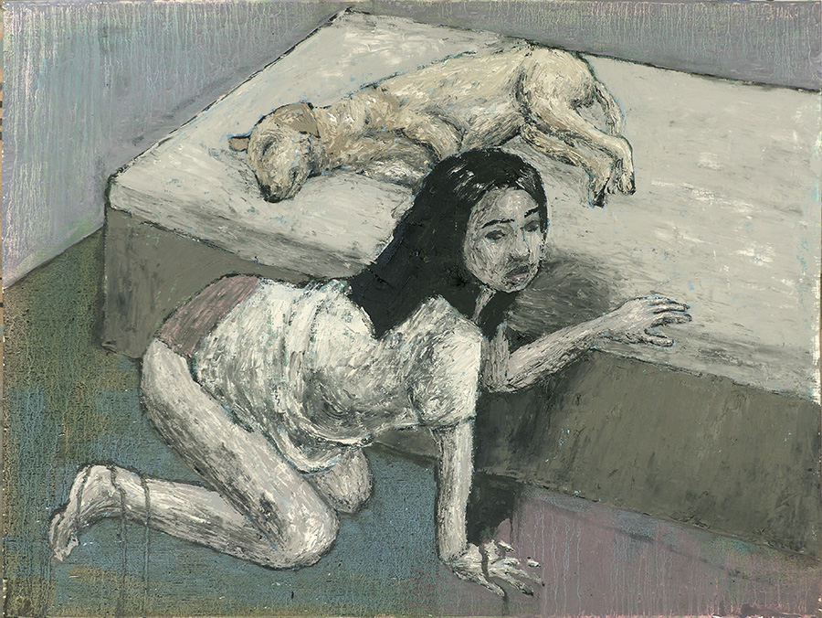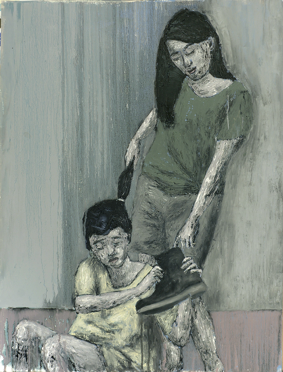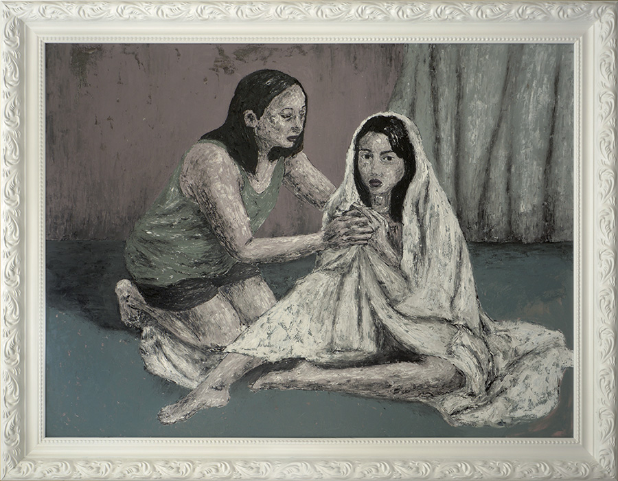 Like in her previous works, the artist confronts the darker side of human relationships and visualizes desolate scenes reflecting social ills and the toll it takes on individuals. In this exhibition, she plays around with the concept of alternative endings by pairing the same scenarios but with different outcomes. She paints pictures that portray disregard for values, disrespect, or the prevalence of hatred in today’s society, to name a few. The contrasting versions of the same story may be thought of as another side of the coin, another twist in the plot. Leading to different conclusions, this set of images forms the Lie of the Land, a phrase describing the current state of things or referring to a present condition. As bleak as they may appear, these scenes define a current state of affairs, a status quo to be challenged and improved.