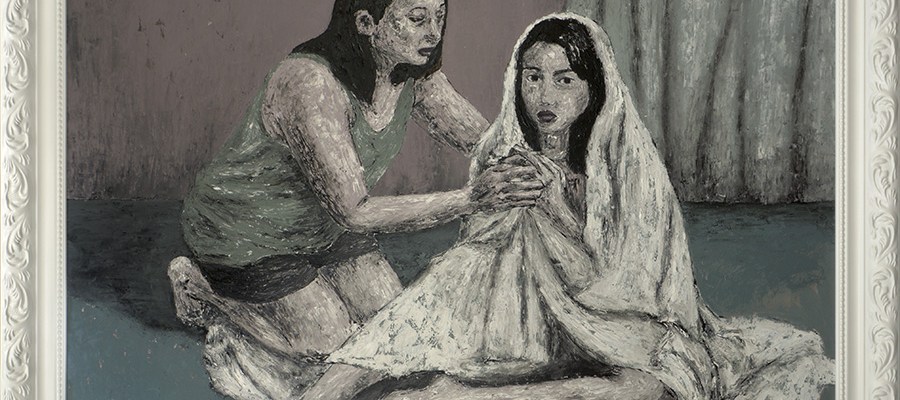Like in her previous works, the artist confronts the darker side of human relationships and visualizes desolate scenes reflecting social ills and the toll it takes on individuals. In this exhibition, she plays around with the concept of alternative endings by pairing the same scenarios but with different outcomes. She paints pictures that portray disregard for values, disrespect, or the prevalence of hatred in today’s society, to name a few. The contrasting versions of the same story may be thought of as another side of the coin, another twist in the plot. Leading to different conclusions, this set of images forms the Lie of the Land, a phrase describing the current state of things or referring to a present condition. As bleak as they may appear, these scenes define a current state of affairs, a status quo to be challenged and improved.