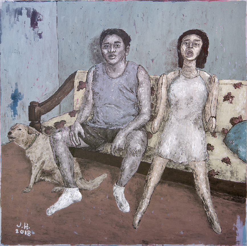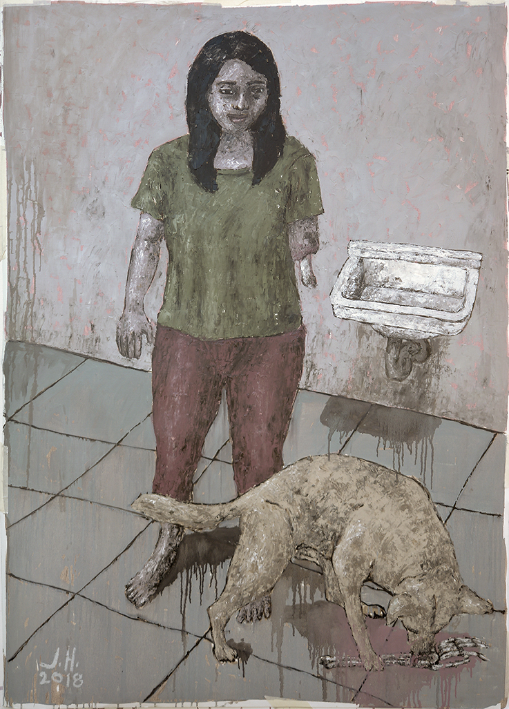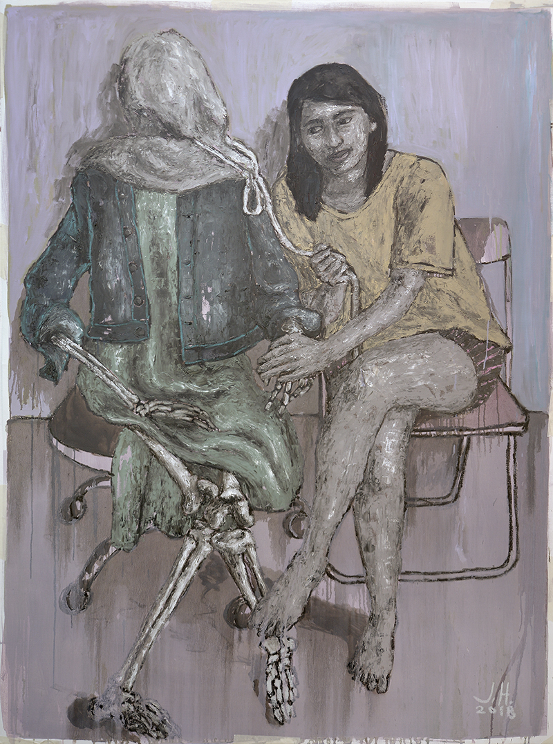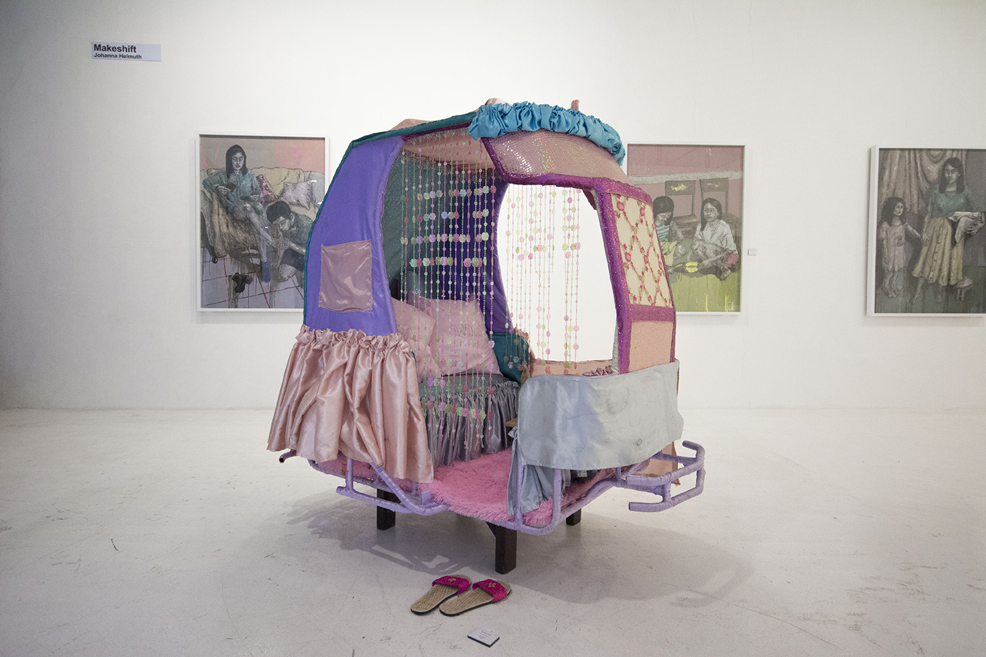 The term Makeshift is formed by piecing together a word denoting a process of creation, and another which means change. Together they imply producing something for the sake of replacement, and such concept bares a fertile ground for multiple levels of associations and significations. In this solo exhibition by Johanna Helmuth, she plays around with the idea of creating substitutes—presenting various scenes and compositions drawn from its literal and figurative instances to navigate a range of possible meanings suggested by the singular act of coming up with replacements. Makeshift is situated in the exhibition across a variety of objects, people, connections and relationships—from images of dolls and mannequins to skeletons, vehicles, and shelters.Various tropes of the idea of makeshift are explored throughout the works crafted from a variety of media. First, it is figured through the discourse of authenticity, opening up discussions on the fake and unreal. Images of dummies, toys, and replicas become recurring motifs and presented as taking the place of humans, interactions, and relationships. These objects posed as real persons offer substitutes for authentic experiences, such as affection and pleasure. Also signified by these figures is in sincerity and pretention, the masks or facades worn by those to intending to deceive and fool. Second, makeshift is framed in relation to sense of time, highlighting its temporary and transitory nature. Here, it becomes synonymous to “for the time being,” not intended for longevity and meant to work only in the present as a sudden need arises. Lastly is the character of ingenuity that makeshift implies, and in this sense the word turns into a positive response to the challenge of scarcity and deprivation, a sort of handy tool that has allowed humanity to survive and flourish across time.